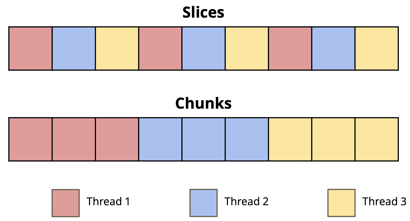 v_add_optimized_adjacent()inex1.c, which separates the vectors into element-wise slices.- If we have 3 threads, thread 0 will handle all elements that are 0 modulo 3 (such as 0, 3, 6, etc), thread 1 will handle all elements that are 1 modulo 3 (such as 1, 4, 7, etc), and thread 2 will handle all elements that are 2 modulo 3 (such as 2, 5, 8, etc).